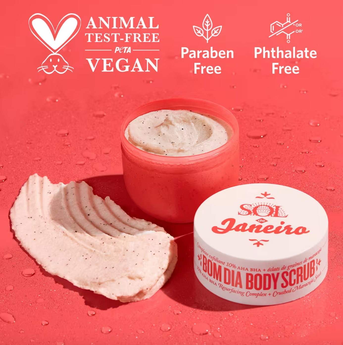 El Bom Dia Body Scrub de Sol de Janeiro, infusionado con un Complejo Renovador de AHA y BHA al 10%, mejora visiblemente la claridad, el tono y la textura de la piel, dejándola más suave y con apariencia más uniforme.Ç
