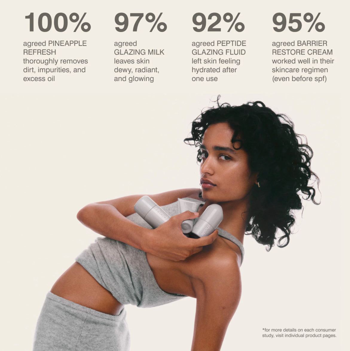 Qué más necesitas saber: Conoce tus nuevos clásicos: Refresco de piña, leche glaseante, líquido de glaseado de péptidos y crema restauradora de barrera. Cada uno está formulado para la máxima nutrición de barrera, se siente soñador en su piel y realiza múltiples tareas en sus rutinas de cuidado de la piel y maquillaje.